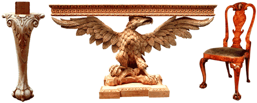 Carved Furniture The hallmark of an exclusive piece of furniture is quality in design and execution. As fashions change and change again, the timeless elegance of period furniture holds an enduring appeal. From a medieval chest to today's finest replica furniture, carving is used to raise the piece from the merely functional to an object of beauty and desire. The eagle console table shown here is an example of how woodcarving may be used to spectacular effect. A seventeenth century design, this table is one of a handed pair, made to hold a solid marble top. The support is an eagle with wings displayed, sculpted from limewood to accept a water gilded finish. More familiar furniture, such as chairs, bureaux, chests of drawers, are lifted with the addition of carved elements: legs may be enriched with acanthus leafwork and ball & claw feet; a bureau may stand upon bears paw feet, with shell motifs adorning the doors, and perhaps an intricately carved crest. We can faithfully replicate furniture of any period, working from existing pieces, or from detailed photographs of historical examples. For the cabinetmaker we offer a bespoke service for the production of carved components: drawing on our extensive experience in period carving, we are able to match existing examples, working from an original, or from photographs or drawings. |