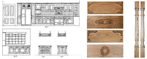 Kitchen and Bedroom Ornamentation We supply the carved decoration in kitchen and bedroom manufacture for your most exclusive projects and higher end designs, from one off motifs to complete interior plans. Our services are used in two ways: Bespoke Designs To add exclusivity and value to bespoke designs, allowing manufacturers to provide a personalised service to their clients. We supply the carved elements to any individual design, working in sympathy with the clients wishes. We can offer examples of our previous work, and a collection of designs to draw inspiration from; we are equally at home working with your designs, carving from photographs and plans, or picking up on a theme suggested by the client. Our experience in this field is extremely rare, combining craftsmanship with artistry, and providing a highly proffessional service. Production Runs Manufacturers will be interested to know that further to the services described above, we undertake small and medium scale production runs to supply hand carved ornamentation to components such as drawer fronts, doors, cooker hoods, pelmets etc. We can offer a catalogue of designs which may be produced to any scale in your specified timber, or altered to fit individual situations. We also produce exclusive designs to add strength to your comany's individual profile. |