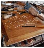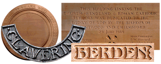 Lettering, Plaques, Inscriptions, Signs and Noticeboards Hand carved lettering is part of our architectural and artistic heritage. Inscriptions carved in wood can be found adorning the nations oldest historic houses and churches. We continue this tradition as part of our woodcarving services, offering lettering incised and in relief, in any style and to any scale. We design and produce signs, plaques and notice boards to your requirements, and are able to put inscriptions to clients' own pieces. We will also work to your own design. Lettering may be painted or highlighted in gold leaf. As woodcarvers, we are able to incorporate further ornamentation, such as period carving, company logos, pictures etc. into our designs to produce stunning signeage. Hotels, local authorities, quality retail outlets, pubs and company headquarters are typical applications for this area of our work. Churches and other organisations use our services for memorial boards, rolls of honour and commemorative plaques. Working to your requirements, we will arrange the complete project, dealing with construction, carving, gilding and installation of your board. |